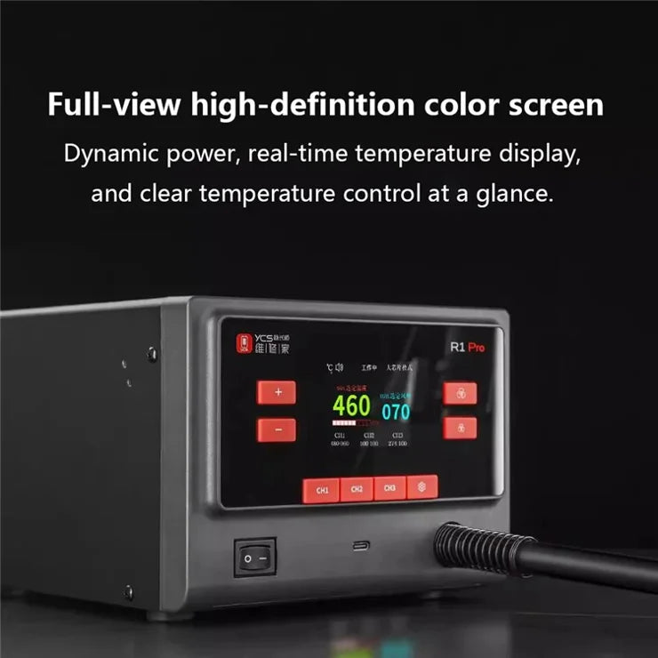 La estación de aire YCS R1 PRO ofrece un rendimiento profesional con una potencia de 1000W, ideal para trabajos precisos y exigentes. Cuenta con 4 boquillas intercambiables que permiten adaptarse a diversas aplicaciones. Su control avanzado incluye 3 canales de memoria para guardar configuraciones personalizadas, facilitando la repetición de tareas. El volumen de aire es ajustable entre 1 y 200, y la temperatura varía de 100 a 555°C, garantizando un manejo óptimo según el proyecto. Una herramienta versátil y confiable para usuarios expertos que buscan eficiencia y precisión.