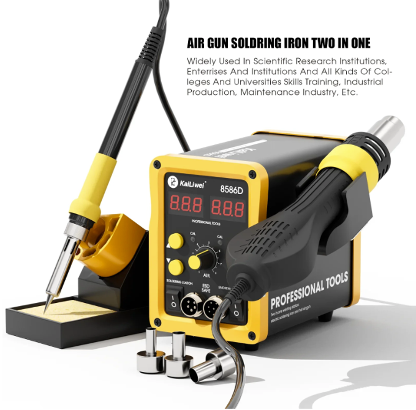 Estación de soldadura profesional Kailiwei 8586d que combina cautín y pistola de aire caliente en un solo equipo. El cautín opera entre 200-500°C mientras la pistola de aire alcanza 100-500°C con flujo de 120L/min. Con potencia de 750W y tres boquillas intercambiables, ofrece versatilidad y precisión para trabajos de electrónica avanzados.