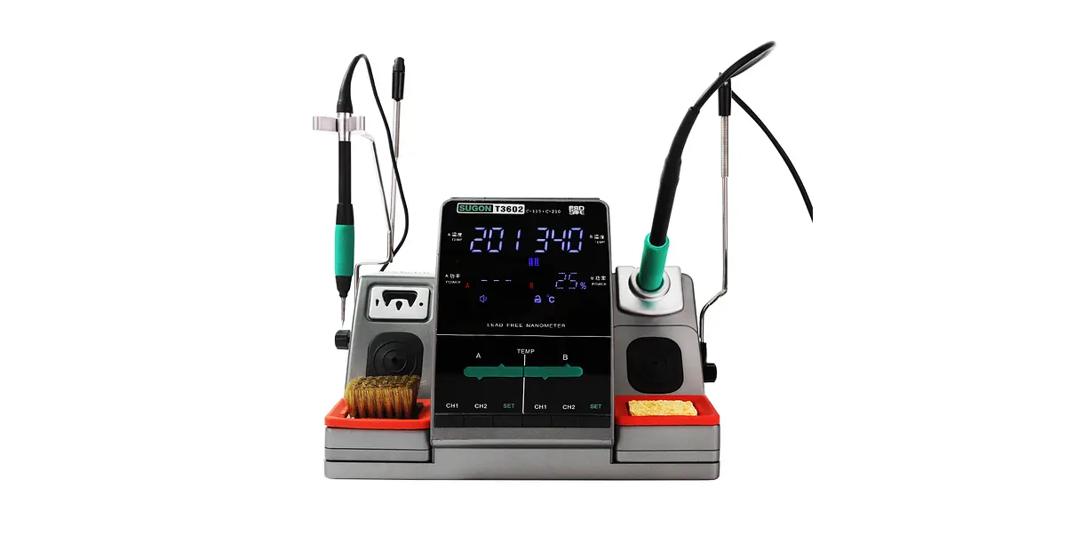 La estación de soldar Sugon T3602 es una herramienta profesional diseñada para trabajos precisos y eficientes. Cuenta con dos salidas, manerales C115 y C210, y una potencia de 240W que garantiza un calentamiento rápido y estable. Incluye un calibrador de temperatura para un control exacto, ideal para aplicaciones que requieren alta precisión y confiabilidad en soldadura electrónica.