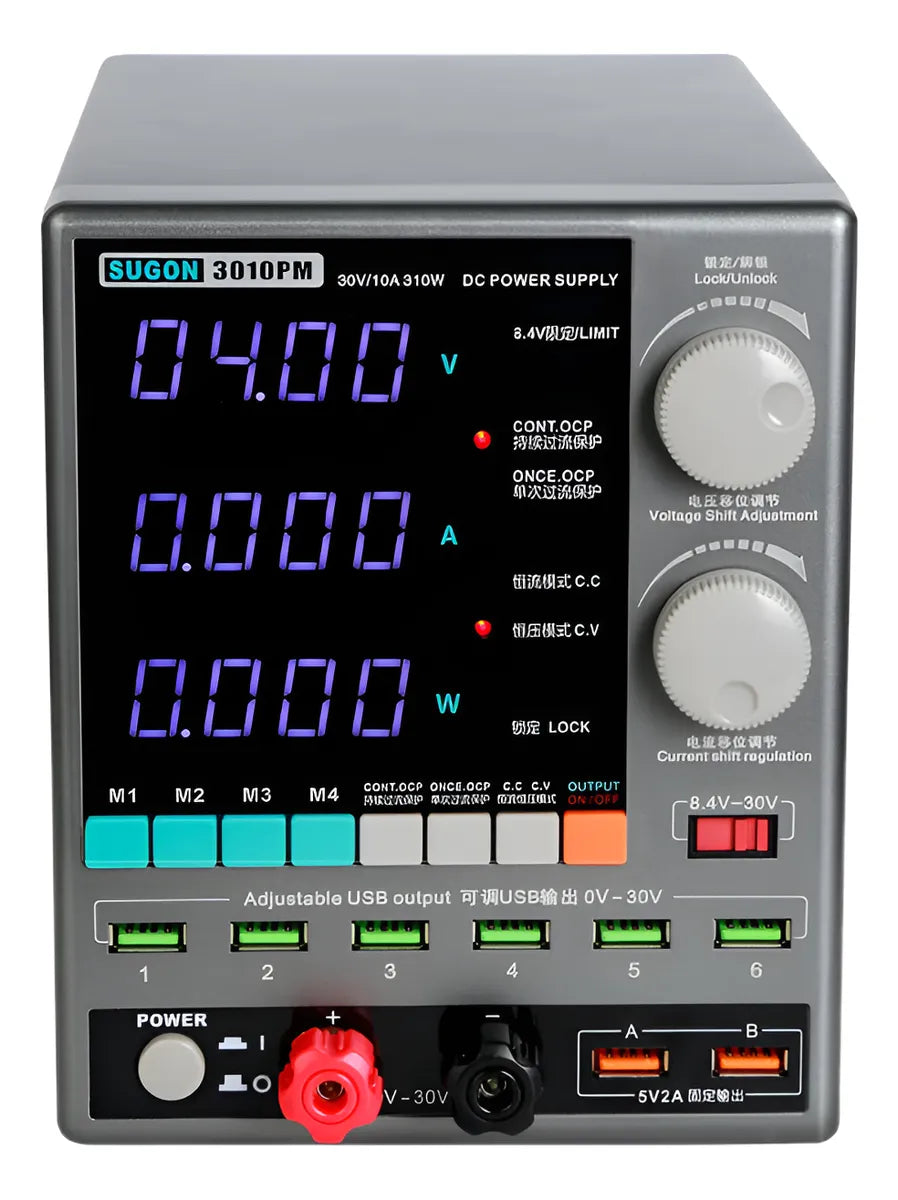 La fuente de poder Sugon 3010PM ofrece una salida ajustable de hasta 30V y 10A, con una potencia máxima de 310W. Cuenta con un display digital de 4 dígitos que muestra voltaje, corriente y potencia en tiempo real. Dispone de 4 canales de memoria para guardar configuraciones, control avanzado de protección OCP, OTP y OPP, y múltiples salidas USB: 2 salidas fijas de 5V/2A y 6 salidas ajustables entre 0 y 30V. Ideal para aplicaciones que requieren precisión y seguridad en el suministro eléctrico.